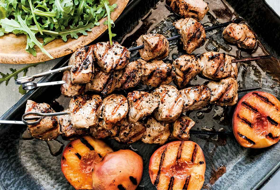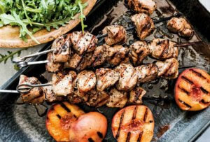 Chunks of pork tenderloin seasoned with our sweet BBQ pecan rub. On the skewer and ready for the grill!