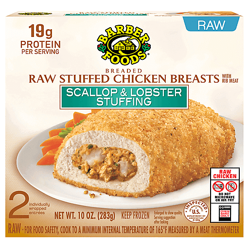 For a delicious entree that is easy to prepare, Barber Foods Breaded Raw Stuffed Chicken Breasts Scallop and Lobster are perfect for any night of the week. We start with a combination of scallops and lobster meat, wrap it all in savory, boneless chicken and add crispy golden brown breading. With 19 grams of protein per serving, these frozen stuffed chicken breasts with rib meat are easy to prepare in the oven. For a tasty meal the whole family will enjoy, prepare and serve with a side of roasted vegetables. Includes one 10 oz package of 2 individually wrapped breaded raw stuffed chicken breasts scallop and lobster. With unmatched flavor and quality, Barber Foods provides the best of everything, and that's been our pledge since we started our business in 1955. Bring Barber Foods stuffed chicken to the table tonight and you’ll find it’s an instant family favorite that’s perfect for every night of the week.