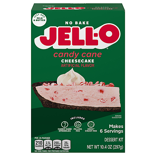 Take a break from your oven with a delightful cheesecake that's ready in 15 minutes with no baking required. Our Jell-O No Bake Candy Cane Cheesecake Artificially Flavored Dessert Kit offers the rich and creamy flavor of peppermint cheesecake without the need for an oven. Each box contains candy cane sprinkles, filling mix and Oreo crust mix. Simply add milk and butter for a festive peppermint cheesecake with a rich, velvety texture. Since our dessert mix requires minimal prep time, you'll spend less time in the kitchen and more time with your family or guests. Our creamy, no-bake cheesecake is perfect for holiday gatherings, parties, picnics or any time you want to prepare a decadent dessert quickly. Each 10.4-ounce box makes six servings, perfect for your entire family to enjoy. You can also use our kit to make a candy cane pie. Enjoy a slice of your favorite dessert anytime with our no-bake cheesecake mix.