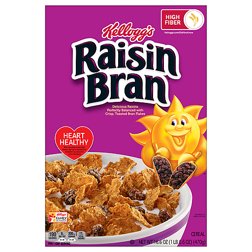 Wake up with Sunny and the simple goodness of Kellogg's Raisin Bran, a deliciously crafted cereal that helps energize the start of your day. This crunchy, healthy cereal is made with crispy, toasted bran flakes balanced with the satisfying taste of sweet raisins in every spoonful; Just as nutritious as it is delicious, this breakfast cereal is heart-healthy (while many factors affect heart disease, diets low in saturated fat and cholesterol may reduce the risk of this disease). Kellogg's Raisin Bran cereal provides an excellent source of fiber and a good source of eight vitamins and minerals to help you start your day off strong. Whether you enjoy your Raisin Bran in a bowlful of your favorite milk for a quick breakfast, sprinkled over yogurt for an afternoon treat, or as a crispy snack straight from the box after your workout, Kellogg's Raisin Bran cereal lets you rise, shine and make the most of your day.
