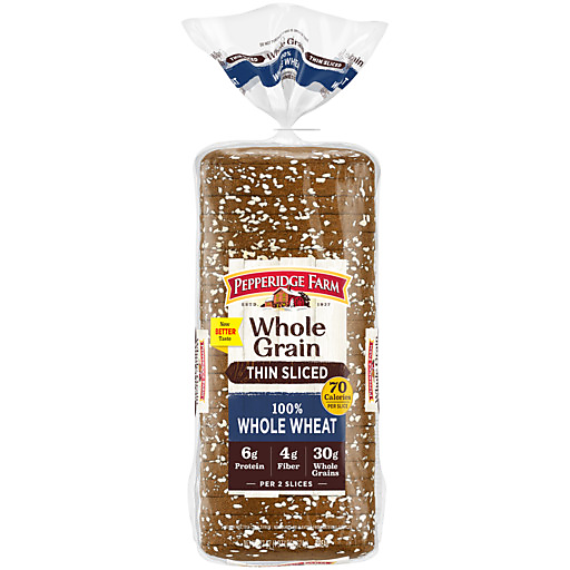 Help maintain a healthy lifestyle, deliciously, with Pepperidge Farm Whole Grain Thin Sliced 100% Whole Wheat Bread. Two slices deliver 6 grams of protein, 4 grams of fiber, and 30 grams of whole grains. With smaller, thinner slices than the original Pepperidge Farm 100% Whole Wheat Bread, each slice is 70 calories. Enjoy this whole grain bread with sandwiches or toast up a slice for breakfast!