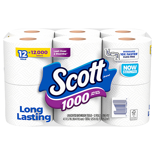 Scott 1000 Toilet Paper helps you spend time on what matters most with fewer roll changes and more value. With Scott 1000 Toilet Paper, you get 12 rolls of 1,000 sheets, so you have plenty of toilet paper for you and your loved ones. Plus, each roll of Scott 1000 bathroom tissue helps you get the job done with 1000 durable 1-layer sheets and lasts longer, dissolves faster* and breaks down 10x faster**. Scott 1000 1-ply toilet paper even dissolves quickly, so it’s kinder to your plumbing, sewer-safe and septic-safe. We’ve been trusted for generations: Scott bathroom tissue is sustainably sourced from responsibly managed forests, features recyclable packaging and is a 100% biodegradable tissue. Keep life rolling by ordering Scott 1000 in bulk online! *vs the leading brand mega roll **vs the leading brand one ply