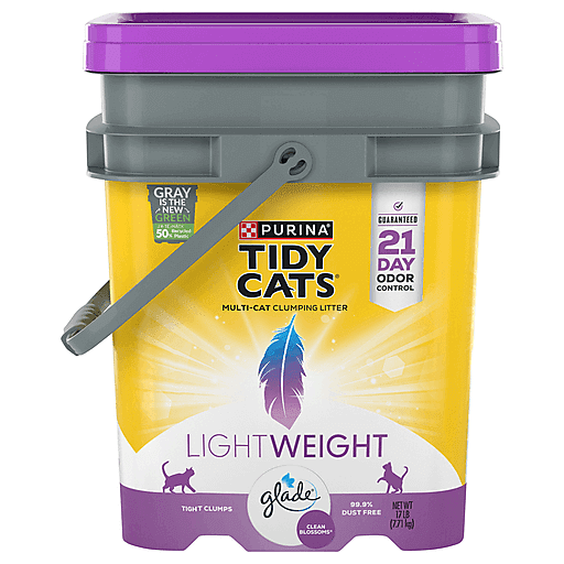 Combine powerful odor control and a pleasant scent without the pain of litterback with Purina Tidy Cats LightWeight Litter With Glade Clean Blossoms Multi-Cat Clumping, scoopable cat litter. This multi cat litter prevents ammonia odor for 21 days (when used as directed) offering great odor protection with a fresh floral scent and a fraction of the weight. Tidy Cats litter is easy to carry, weighing half as much as the leading clumping cat litter without sacrificing litter amount. The low dust cat litter is easy to use and is 99.9 percent dust free and forms strong, tight clumps for quick and easy scooping. This multi cat litter offers an option for large cat families with a powerfully absorbent scented cat litter that can go into every cat litter box to make each box a welcoming place for your cats. Add Purina Tidy Cats LightWeight With Glade Clean Blossoms clumping cat litter odor control to your cat’s litter box for a reliable litter with the performance you expect with less weight.